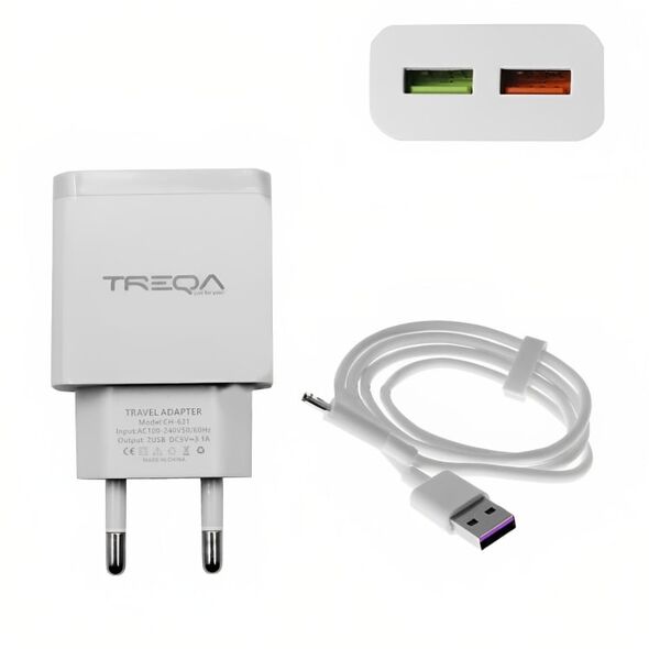 Φορτιστής Ταχείας Φόρτισης με 2 Θύρες USB 3.1A και Καλώδιο USB TypeC - Treqa