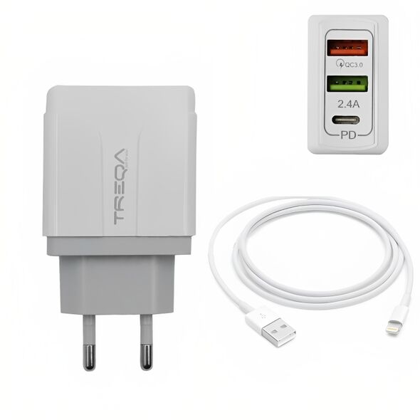 Φορτιστής Ταχείας Φόρτισης με 2 Θύρες USB 5.4A, 1 θύρα USB-C PD 38W και Καλώδιο Lightning - Treqa