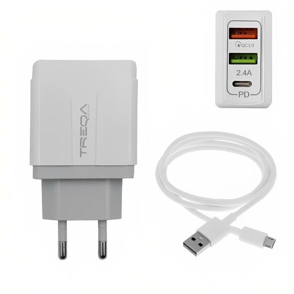 Φορτιστής Ταχείας Φόρτισης με 2 Θύρες USB 5.4A, 1 θύρα USB-C PD 38W και Καλώδιο Micro USB - Treqa