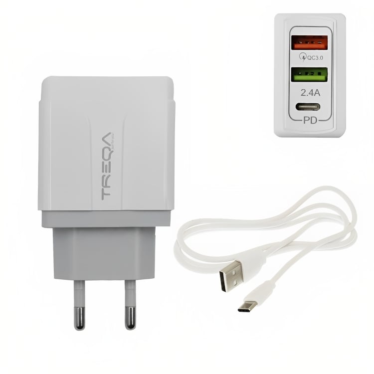 Φορτιστής Ταχείας Φόρτισης με 2 Θύρες USB 5.4A, 1 θύρα USB-C PD 38W και Καλώδιο USB TypeC - Treqa