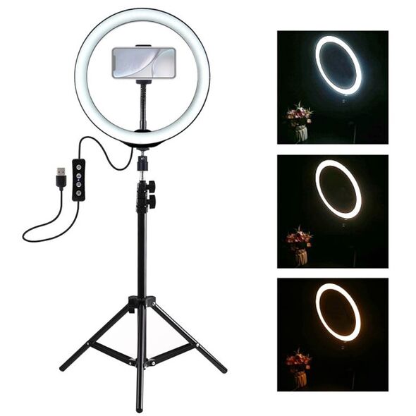 Φωτογραφικό Φωτιστικό Δαχτυλίδι LED 26cm USB με Ρυθμιζόμενο Θερμό & Ψυχρό Φωτισμό - Dimmer - Τρίποδο 110cm & Βάση Στήριξης Κινητού - Ring Light Lamp