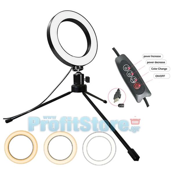 Φωτογραφικό Φωτιστικό Δαχτυλίδι Ring Lamp Light LED USB 16cm με 3 Χρώματα Φωτισμού, Dimmer & Τρίποδο