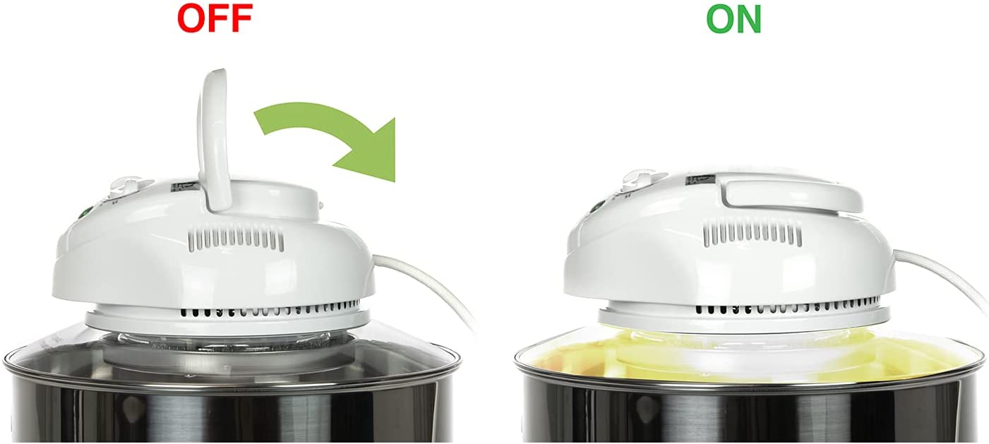 Κουμπί ασφαλείας: Αφού ρυθμίσετε την ώρα και τη θερμοκρασία, πατήστε το κουμπί ασφαλείας και χαμηλώστε τη λαβή και, στη συνέχεια, μπορείτε να ξεκινήσετε το μαγείρεμα στο φούρνο με ζεστό αέρα.