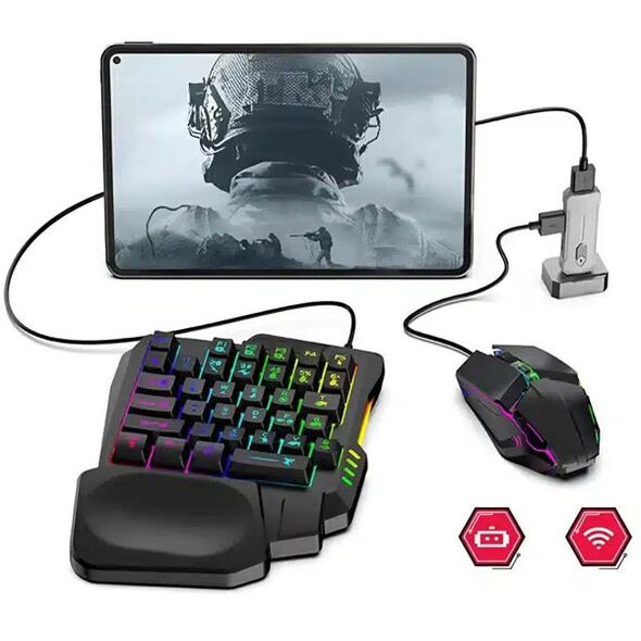 Πλήρες σετ με φωτιζόμενο RGB LED Πληκτρολόγιο και ποντίκι, τα οποία συνδέονται με έναν αντάπτορα Bluetooth, ο οποίος με την σειρά του, συνδέεται με το κινητό σας ασύρματα.
