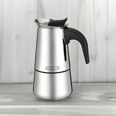 Καφετιέρα Εσπρεσσο για 6 φλυτζάνια. Κατάλληλη για εστία και γκάζι. Με βαλβίδα Ασφαλείας. Σε ασημένιο χρώμα.