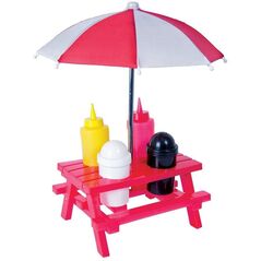 Το μίνι τραπέζι εξοχής έρχεται με τέσσερα πολύ όμορφα πλαστικά δοχεία, δύο πλαστικά μπουκάλια με ειδικό στόμιο, κόκκινο για κέτσαπ και κίτρινο για μουστάρδα, και δύο δοχεία για το αλατοπίπερο! Ένα πανέμορφο σετάκι για να παίρνετε μαζί σας στις διακοπές και τα πικνίκ σας!