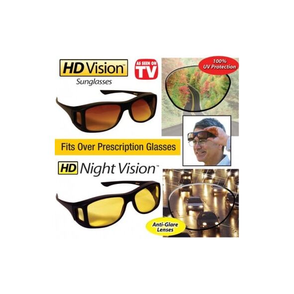 Η συσκευασία περιλαμβάνει 2 ζευγάρια γυαλιά ηλίου HD Vision. Ένα ζευγάρι με κίτρινους φακούς Night Vision και ένα ζευγάρι με μαύρους φακούς για καθημερινή χρήση.
