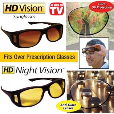 Η συσκευασία περιλαμβάνει 2 ζευγάρια γυαλιά ηλίου HD Vision. Ένα ζευγάρι με κίτρινους φακούς Night Vision και ένα ζευγάρι με μαύρους φακούς για καθημερινή χρήση.