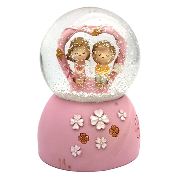 Γυάλινη Χιονόμπαλα με Καρδιά και Δύο Ανθρωπάκια σε Ροζ Χρώμα 8x12cm