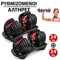 Καινοτόμα ρυθμιζόμενων κιλών βαράκια. Μόνο με ένα αλτήρα και τον πρωτοποριακό αυτό μηχανισμό, μπορείτε να έχετε όσα κιλά χρειάζεστε μόνο με μια απλή περιστροφική κίνηση! Πλήρη σειρά επιλογών βάρους από 4 έως 24 κιλά!
