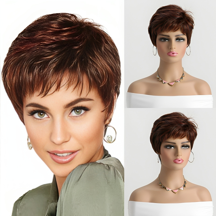 Αναβαθμίστε το στυλ σας με την Γυναικεία Περούκα σε χρώμα καφέ τζίντζερ με κοντό κούρεμα και τουφάκια - αφέλειες, το τέλειο αξεσουάρ για να μεταμορφώσετε την εμφάνισή σας χωρίς κόπο.