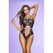 Κομψό μαύρο κορμάκι Brazil σε ελαστική δαντέλα και δεσίματα με strass λεπτομέρειες για πολυτελή και εντυπωσιακές εμφανίσεις.