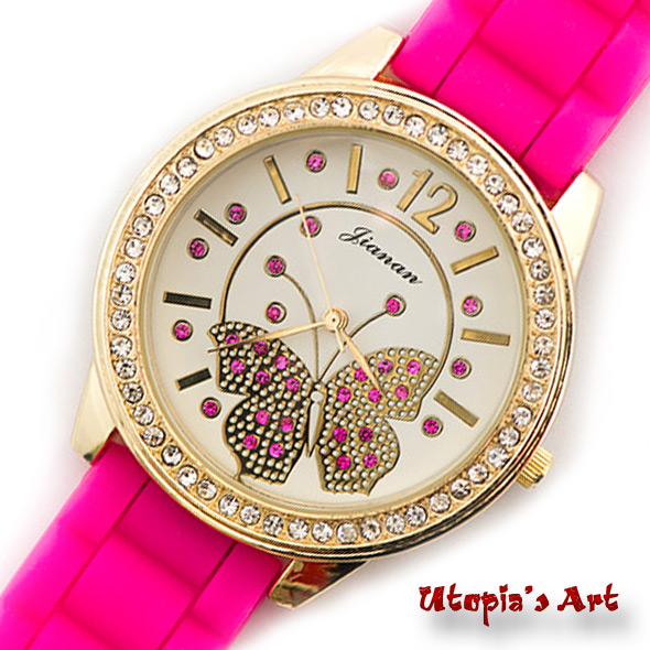 - Γυναικείο ρολόι με χρωματιστό λουράκι σιλικόνης. Το καντράν εσωτερικά είναι σε λευκό χρώμα, διακοσμημένο με strass πεταδουλίτσα σε χρυσό χρώμα και κρυσταλλάκια. Η κάσα είναι σε χρυσό χρώμα με στεφάνη από κρυσταλλάκια. (Διάμετρος κάσας: 44mm).