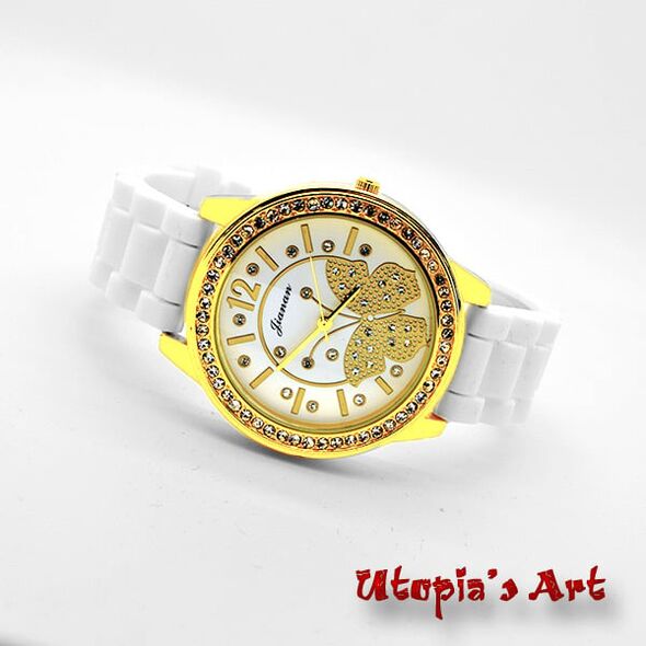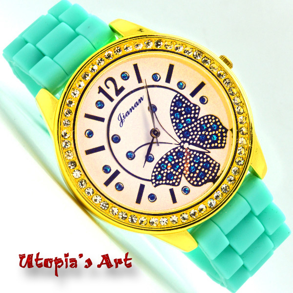 - Γυναικείο ρολόι με χρωματιστό λουράκι σιλικόνης. Το καντράν εσωτερικά είναι σε λευκό χρώμα, διακοσμημένο με strass πεταδουλίτσα σε χρυσό χρώμα και κρυσταλλάκια. Η κάσα είναι σε χρυσό χρώμα με στεφάνη από κρυσταλλάκια. (Διάμετρος κάσας: 44mm).