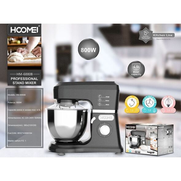 Hoomei® Επαγγελματικό Μίξερ 800W με Κάδο 4.5L - 6 Ταχύτητες - Λειτουργία Παλμού & 3 Εξαρτήματα Ζυμώματος HM-6880B