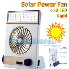 Ηλιακός Φορητός Επαναφορτιζόμενος Ανεμιστήρας Box Fan με ισχυρό φωτιστικό LED. Φορτίζει από τον ήλιο ή από το ρεύμα. Ρυθμιζόμενη ένταση ανεμιστήρα. Ισχυρός Φακός 150 Lumens που φωτίζει και έως 200μ μακρυά. Φωτιστικό με 30 πολύ φωτεινά LED. Επαναφορτιζόμενη μπαταρία 1,4Ah.