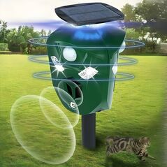 Αυτόνομο ηλιακό απωθητικό ζώων με ανιχνευτές κίνησης 360°. Χρησιμοποιεί υπερήχους και φωτεινά σήματα για να απωθεί γάτες, σκύλους, πτηνά και άλλα ζώα. Με ηλιακή φόρτιση & κάλυψη 700m². Οικολογικό, ασφαλές για ανθρώπους και κατοικίδια, ιδανικό για κήπους και εξωτερικούς χώρους.