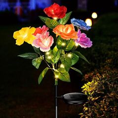 Πολύχρωμο ηλιακό φωτιστικό εξωτερικού χώρου με φωτοκύτταρο και πιστοποίηση IP65. Σε σχήμα ρεαλιστικών τριαντάφυλλων, ιδανικό για διακόσμηση κήπου και ατμοσφαιρικό φωτισμό χωρίς καλώδια.