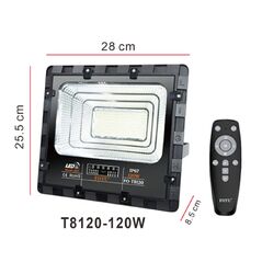 Ηλιακός προβολέας LED σε μαύρο χρώμα, με ισχύ 120W. Διαθέτει τηλεχειριστήριο για να το ελέγχετε από απόσταση. Διαθέτει βαθμό προστασίας IP67, που δηλώνει ότι έχει πλήρη προστασία από τη σκόνη και αδιάβροχη προστασία από προσωρινή βύθιση σε νερό.