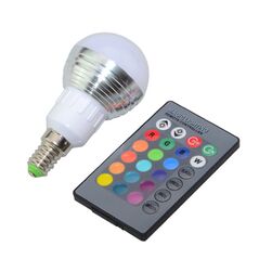 RGB Led Λάμπα E14 3Watt με λεπτό σπείρωμα, για εξοικονόμηση ενέργειας και ατμοσφαιρικό φωτισμό μαζί με ασύρματο τηλεχειριστήριο για αυτόματη εναλλαγή 16 χρωμάτων. Αλλάξτε χρώμα στον χώρο σας με το πάτημα ενός κουμπιού!