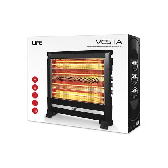 H επιβλητικών διαστάσεων θερμάστρα χαλαζία LIFE VESTA, έχει μεγάλη εμβέλεια θέρμανσης, 4 μεγάλες θερμαντικές λάμπες μήκους 58εκ. η κάθε μία και επιτυγχάνει άμεση απόδοση θερμότητας στον χώρο σας.