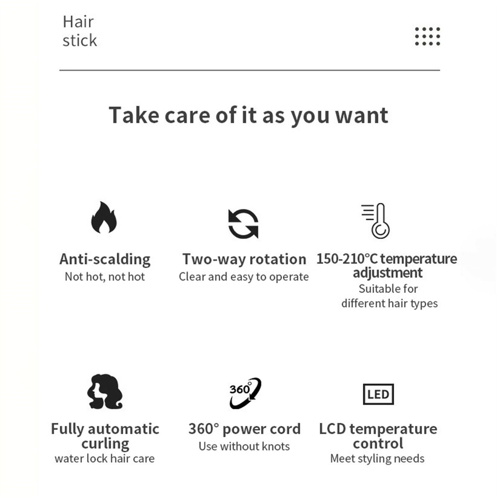 Δεδομένου ότι τα μαλλιά του καθενός είναι διαφορετικά βάσει σκληρότητας και τύπου, αυτό το αναβαθμισμένο πιστολάκι για μπούκλες έχει σχεδιαστεί με 7 διαφορετικές ρυθμίσεις θερμοκρασίας από 150° έως 210° και επιλογή χρόνου 5-10 δευτερόλεπτα.