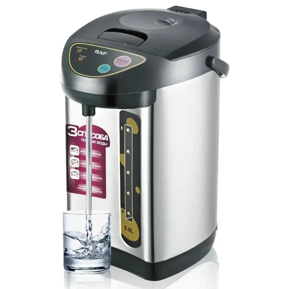 Ηλεκτρικός βραστήρας RAF 6.8L με ανοξείδωτη δεξαμενή, ενσωματωμένη αντλία για άνετη ροή, ισχύ 800W και περιστρεφόμενη βάση 360°. Ιδανικός για σπίτι, γραφείο και επαγγελματικούς χώρους, με ασφάλεια dry-boil και φωτεινές ενδείξεις.