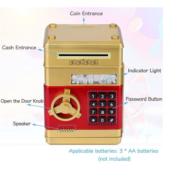 Ο Ηλεκτρονικός Κουμπαράς Χρηματοκιβώτιο με κωδικό ασφαλείας ανοίγει με ηλεκτρονικό συνδυασμό, οπότε μπορείτε κατά διαστήματα να μετράτε τις αποταμιεύσεις σας χωρίς να χρειάζεται να τον καταστρέψετε! Ιδανικό δώρο για τα παιδιά ώστε να μάθουν από μικρά την αξία της αποταμίευσης, με ευχάριστο τρόπο!