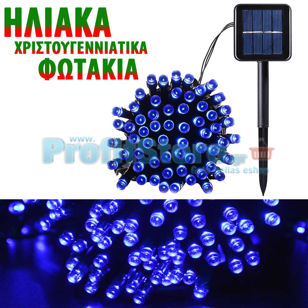 Ηλιακά Χριστουγεννιάτικα Λαμπάκια Μπλε Φωτισμού - Φωτάκια 100 LED Εξωτερικού Χώρου με Φωτοβολταϊκό Πάνελ 10m