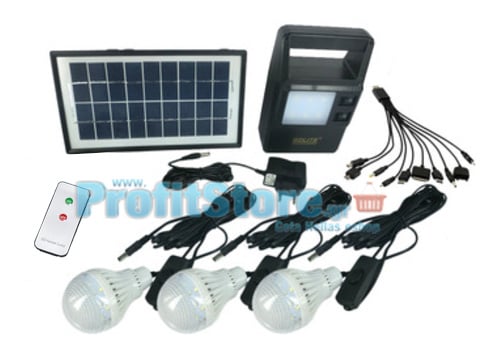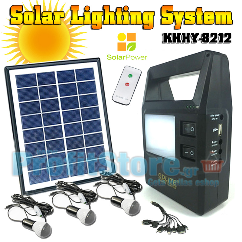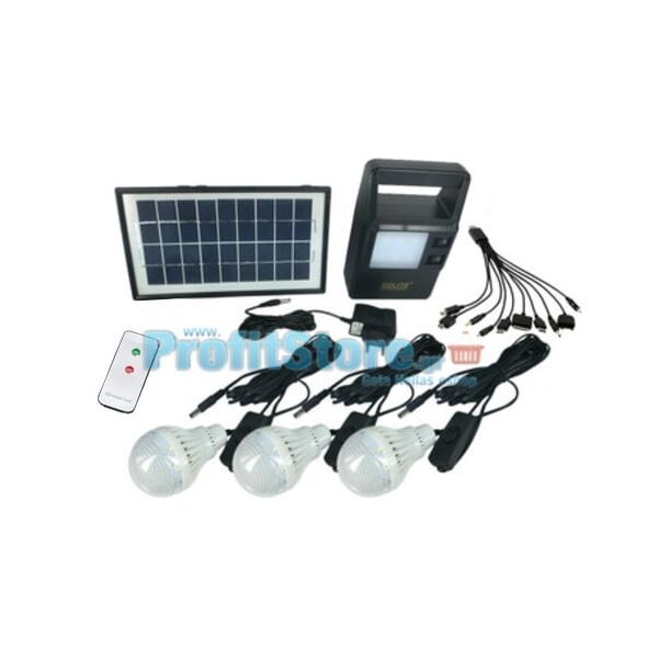 Πλήρες ηλιακό πακέτο φωτισμού με ηλιακό panel 3 Watt, μπαταρία με δυνατό φωτιστικό/φακό LED, θύρα USB για φόρτιση συσκευών, 3 λάμπες led 100 Lumens, πλεξούδα usb με αντάπτορες για φόρτιση διαφορετικών συσκευών και κινητών τηλεφώνων καθώς και τηλεχειριστήριο.