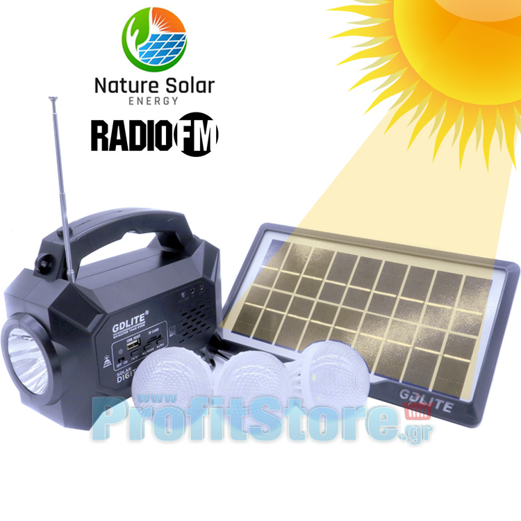 Ηλιακό Πακέτο Σύστημα Φωτισμού - Φακός - Φωτιστικό με Πάνελ, Φορτιστή & Ηχείο Ραδιόφωνο FM/USB/SD MP3 Player με 3 Λάμπες LED 100 Lumens