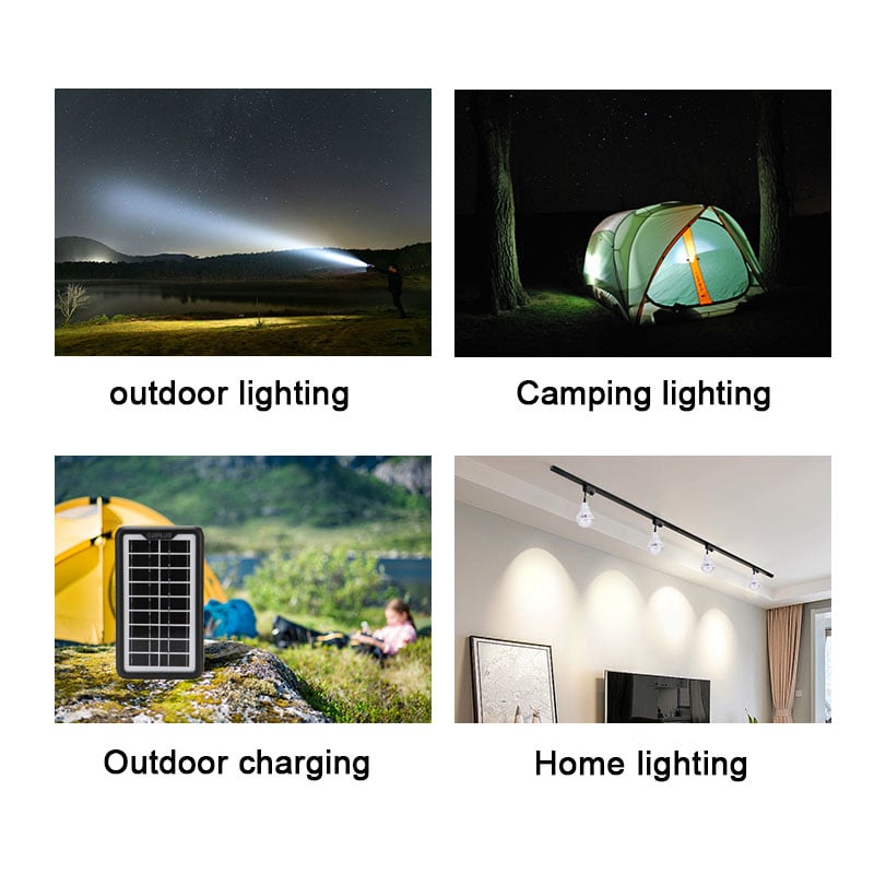 Φορτίστε την μπαταρία - φακό - φωτιστικό LED κατά την διάρκεια της ημέρας με το ηλιακό φως, μέσω του ηλιακού πάνελ / solar panel. Κρεμάστε τις λάμπες περιμετρικά του χώρου σας, συνδέστε τις με την μπαταρία (οι λάμπες διαθέτουν ειδικά καλώδια για σύνδεση με μία κίνηση) και απολαύστε δωρεάν φωτισμό καθ' όλη την νύχτα ώστε να μπορείτε να κάνετε βασικές δουλειές.