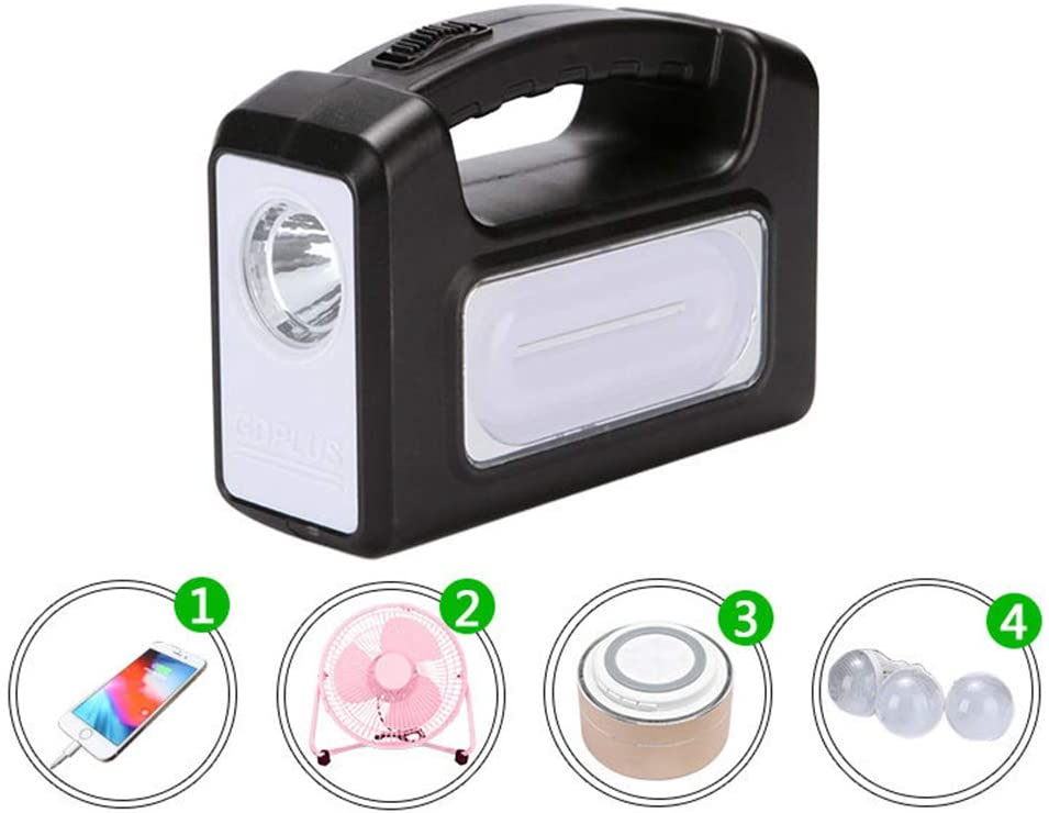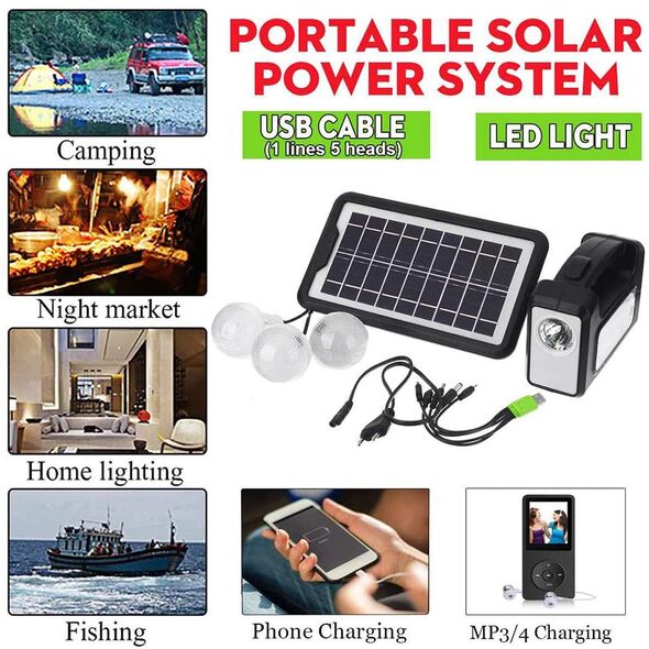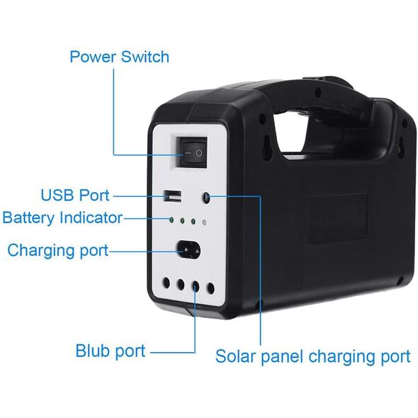 Εξαιρετικά μικρό και φορητό, πλήρες ηλιακό πακέτο φωτισμού με ηλιακό panel 3,5W, ισχυρότατο διπλό φακό LED 400 Lumens, πλαϊνό φωτιστικό LED 400LM, θύρα USB για φόρτιση συσκευών, 3 λάμπες led μεγάλης φωτεινότητας 100LM η κάθε μία και πλεξούδα usb με αντάπτορες για φόρτιση διαφορετικών συσκευών και κινητών τηλεφώνων.