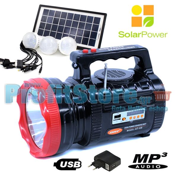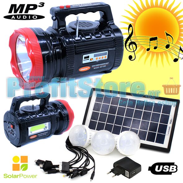 Ηλιακό Σύστημα Φωτισμού & Φόρτισης με Panel 3W, Μπαταρία, Ισχυρό Φακό & Φωτιστικό, Ηχοσύστημα Mp3/USB/TF/FM Player & 3 Λάμπες LED