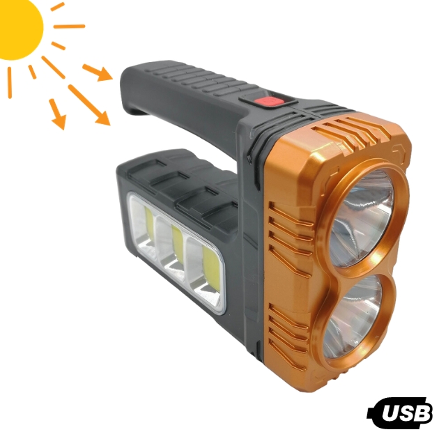 Ηλιακός Επαναφορτιζόμενος Διπλός Φακός LED - XPE/COB - USB 5V - 3 Λειτουργίες Φωτισμού