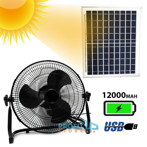 Ηλιακός Φορητός Επιδαπέδιος Ανεμιστήρας 36cm με Επαναφορτιζόμενη Μπαταρία 12000mAh 15W Τριών Ταχυτήτων & USB Powerbank Έξοδο Φόρτισης - Μαύρο