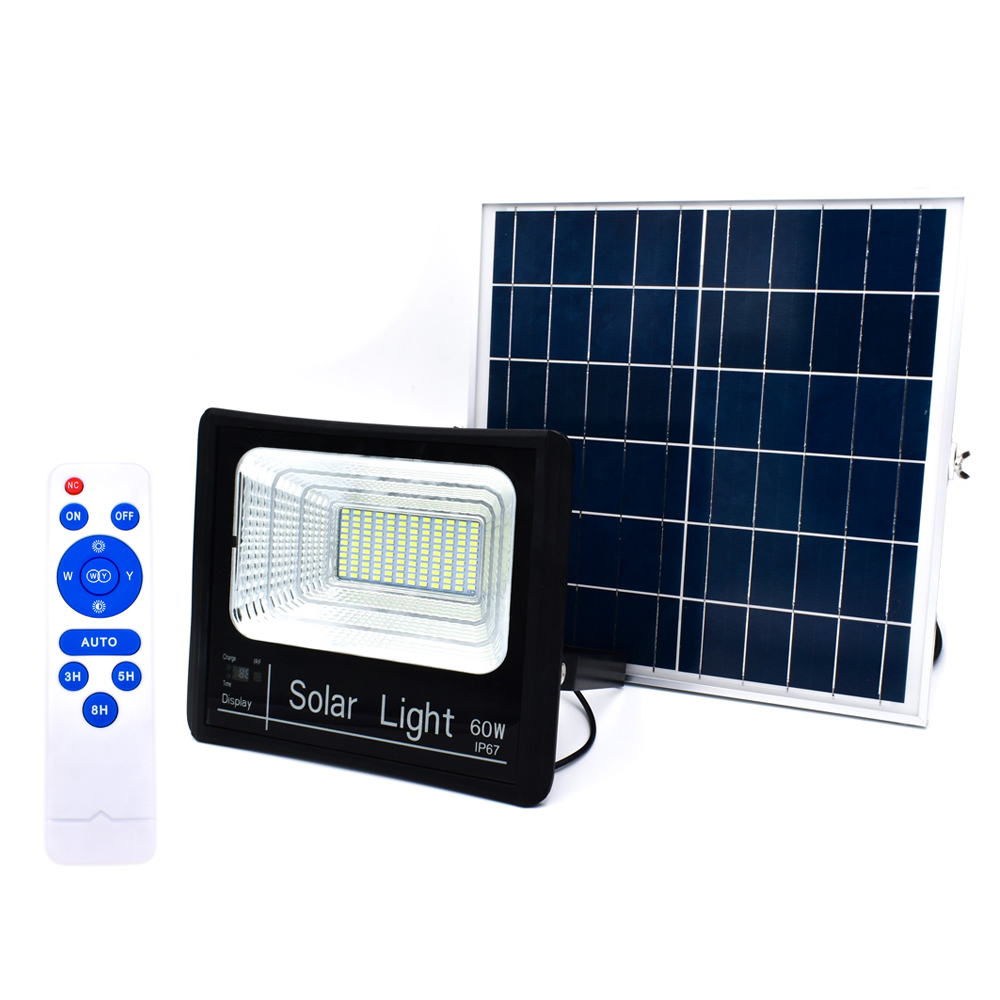 Ηλιακός προβολέας με 132LED αλουμινίου 60W IP67 με τηλεχειριστήριο και χρονοδιακόπτη. Τοποθετείστε τον σε μέρος φωτεινό και απολαύστε φως αυτόματα μόλις σκοτεινιάσει στη αυλή, το εξοχικό, σε στενά, την επιχείρηση και όπου δεν είναι διαθέσιμη τροφοδοσία ρεύματος. Εκμεταλλευτείτε την δωρεάν ενέργεια του ήλιου κι εξοικονομήστε χρήματα εύκολα και αποδοτικά!!