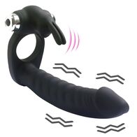 Δονητής & Δονούμενο Δαχτυλίδι Πέους με Ντίλντο & Αυτάκια Rabbit για Πρωκτική, Κολπική & Κλειτοριδική Διέγερση με Μπαταρία - Διπλή Διείσδυση - Anal, Vaginal & Clitoris Trinity Fun Dildo - Μαύρο