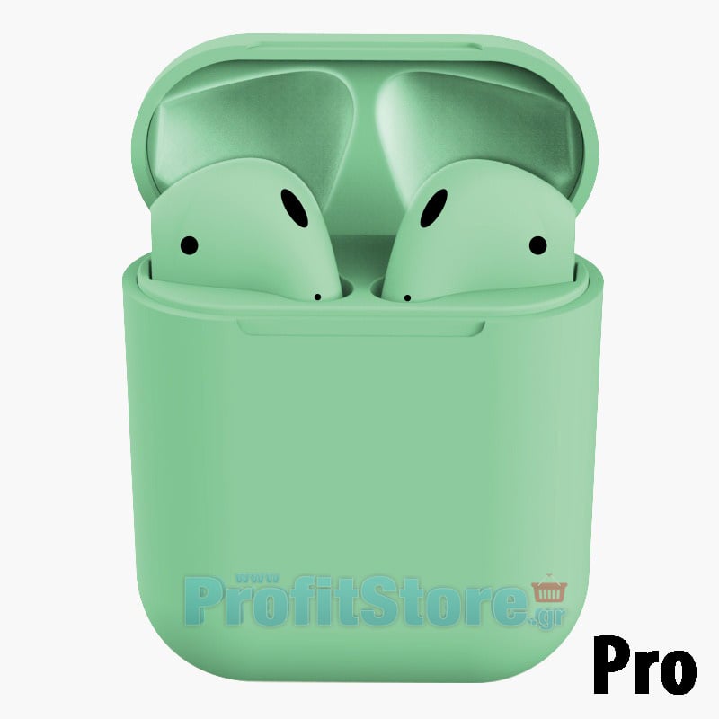 Pro Version χρωματιστά ακουστικά αφής σε πράσινο χρώμα, bluetooth 5.0, τύπου iPhone με αυτοματοποιημένη σύνδεση με pop-up window στο κινητό με το άνοιγμα της θήκης φόρτισης.