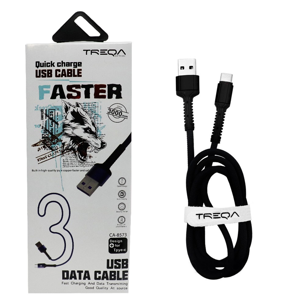 Καλώδιο Γρήγορης Φόρτισης και Μεταφοράς Δεδομένων 3m USB 3.1A σε Type-c Treqa CA-8573-B Μαύρο