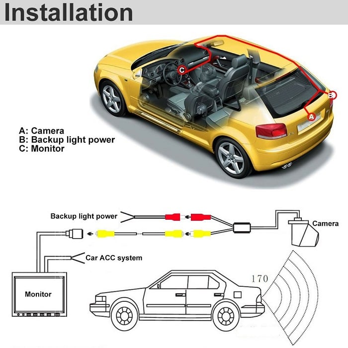 Συνοδεύεται από ποτήρι ( τρυπάνι ) 28 χιλιοστών για εύκολη εγκατάσταση της κάμερας στο αυτοκίνητό σας. Περιλαμβάνεται 6 μέτρα καλώδιο βίντεο, με υποδοχή RCA, για όλα τα είδη των αυτοκινήτων και οθονών.