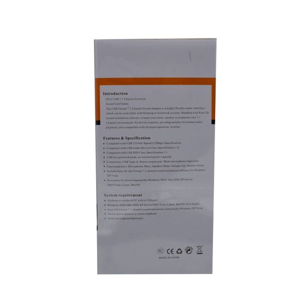 Με κορυφαία ποιότητα απόδοσης 3D sound simulation. Δυνατότητα ρύθμισης έντασης μικροφώνου και ακουστικών. Τεχνολογίας Plug and Play μέσω θύρας USB 2.0. Συμβατό με τις περισσότερες κύριες μάρκες υπολογιστών.