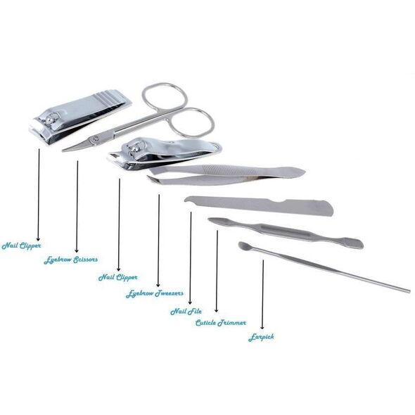 - Nail Cutter, Nail Clipper, Tweezers, Scissor, Nail Filer, Ear Cleaner, Cuticle Pusher