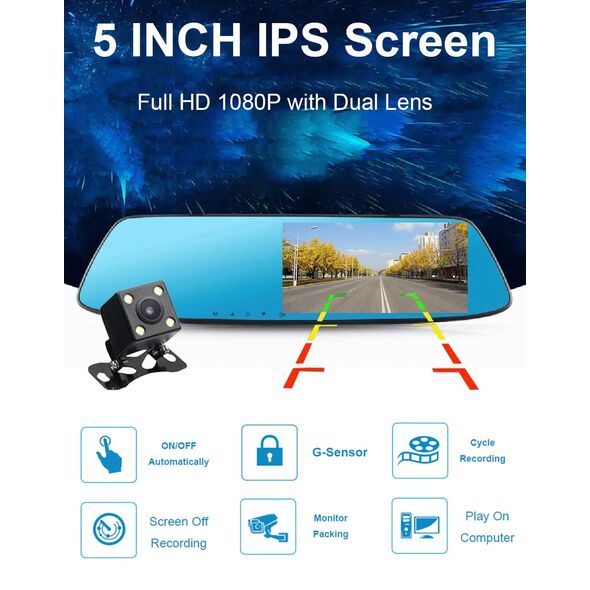 Αυτός ο καθρέπτης με κάμερα διαθέτει μεγάλη και ευδιάκριτη οθόνη 4,9 inch και πολλές λειτουργίες όπως Ανιχνευτή Κίνησης, G sensor και παρακολούθηση στάθμευσης.