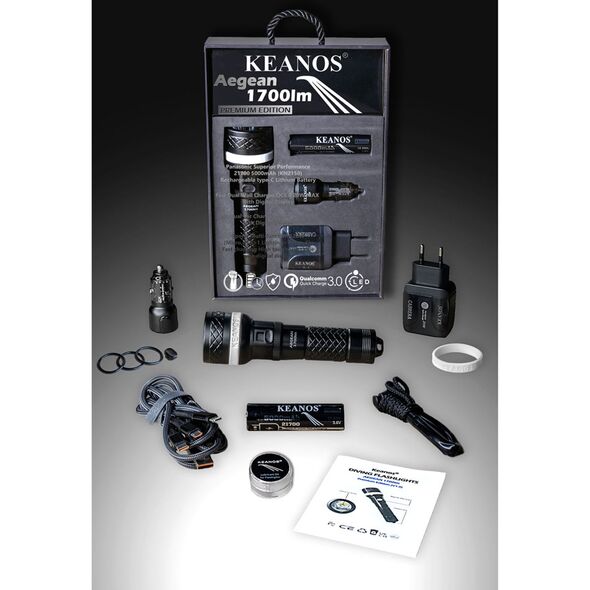 Είναι ιδανικός για ελεύθερη κατάδυση, για υποβρύχια φωτογράφηση, κυνήγι ψαριών και εξερεύνηση σπηλαίων και ναυαγίων αποδίδοντας ψυχρό λευκό φως (6500Κ). Είναι στιβαρός και αρκετά ανθεκτικός γιατί κατασκευάζεται από υψηλής ποιότητας ανωδιωμένο κράμα αλουμινίου αεροπορικού τύπου ενώ η τραχιά του επιφάνεια ενισχύει αποτελεσματικά την αντιολισθητική του απόδοση. Το σώμα με διπλή κυλινδρική επίστρωση διαθέτει βέλτιστη ανθεκτικότητα και προστασία από τη διάβρωση του θαλασσινού νερού. Στον Keanos® Aegean 1700lm έχουν εγκατασταθεί υψηλής ποιότητας επιχρυσωμένα και ανοξείδωτα ελατήρια που αποτρέπουν την οξείδωση και διάβρωση των μπαταριών και βελτιώνουν την αποτελεσματικότητά τους.