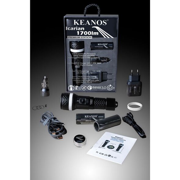 Είναι ιδανικός για ελεύθερη κατάδυση, για υποβρύχια φωτογράφηση, κυνήγι ψαριών και εξερεύνηση σπηλαίων και ναυαγίων αποδίδοντας ψυχρό λευκό φως (6500Κ). Είναι στιβαρός και αρκετά ανθεκτικός γιατί κατασκευάζεται από υψηλής ποιότητας ανωδιωμένο κράμα αλουμινίου αεροπορικού τύπου ενώ η τραχιά του επιφάνεια ενισχύει αποτελεσματικά την αντιολισθητική του απόδοση. Στον Keanos® Icarian 1700lm έχουν εγκατασταθεί επιχρυσωμένα και ανοξείδωτα ελατήρια υψηλής ποιότητας, που αποτρέπουν την οξείδωση και διάβρωση των μπαταριών και βελτιώνουν την αποτελεσματικότητά τους.