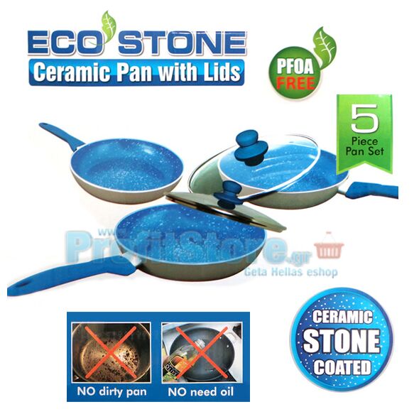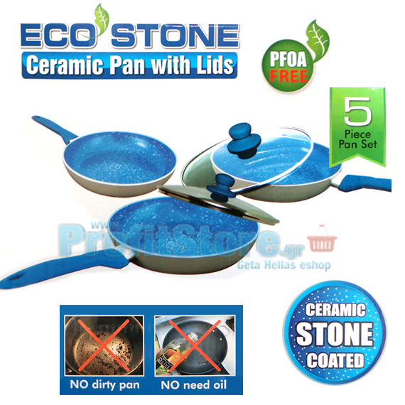 Υψηλής ποιότητας κεραμικά τηγάνια με αντικολλητική επίστρωση ECOSTONE για αντοχή στα γδαρσίματα και χωρίς τα χημικά PTFE και PFOA, που απελευθερώνουν τοξικές ουσίες στο φαγητό, επικίνδυνες για την υγεία.