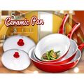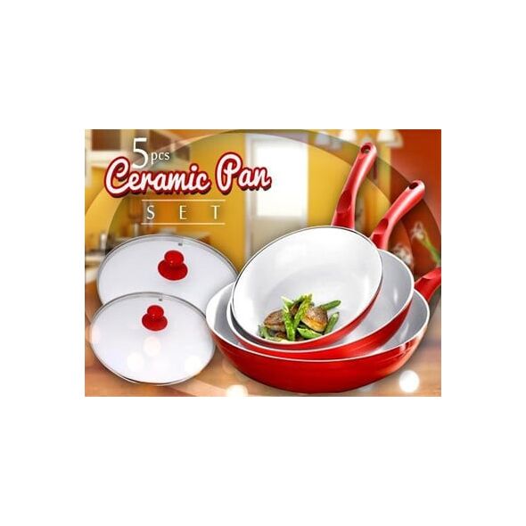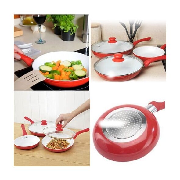 Κεραμικά τηγάνια κόκκινου χρώματος με αντικολλητική επίστρωση χωρίς τα χημικά PTFE και PFOA, που απελευθερώνουν τοξικές ουσίες στο φαγητό, επικίνδυνες για την υγεία.