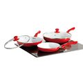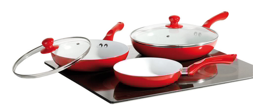 Κεραμικά τηγάνια κόκκινου χρώματος με αντικολλητική επίστρωση χωρίς τα χημικά PTFE και PFOA, που απελευθερώνουν τοξικές ουσίες στο φαγητό, επικίνδυνες για την υγεία.