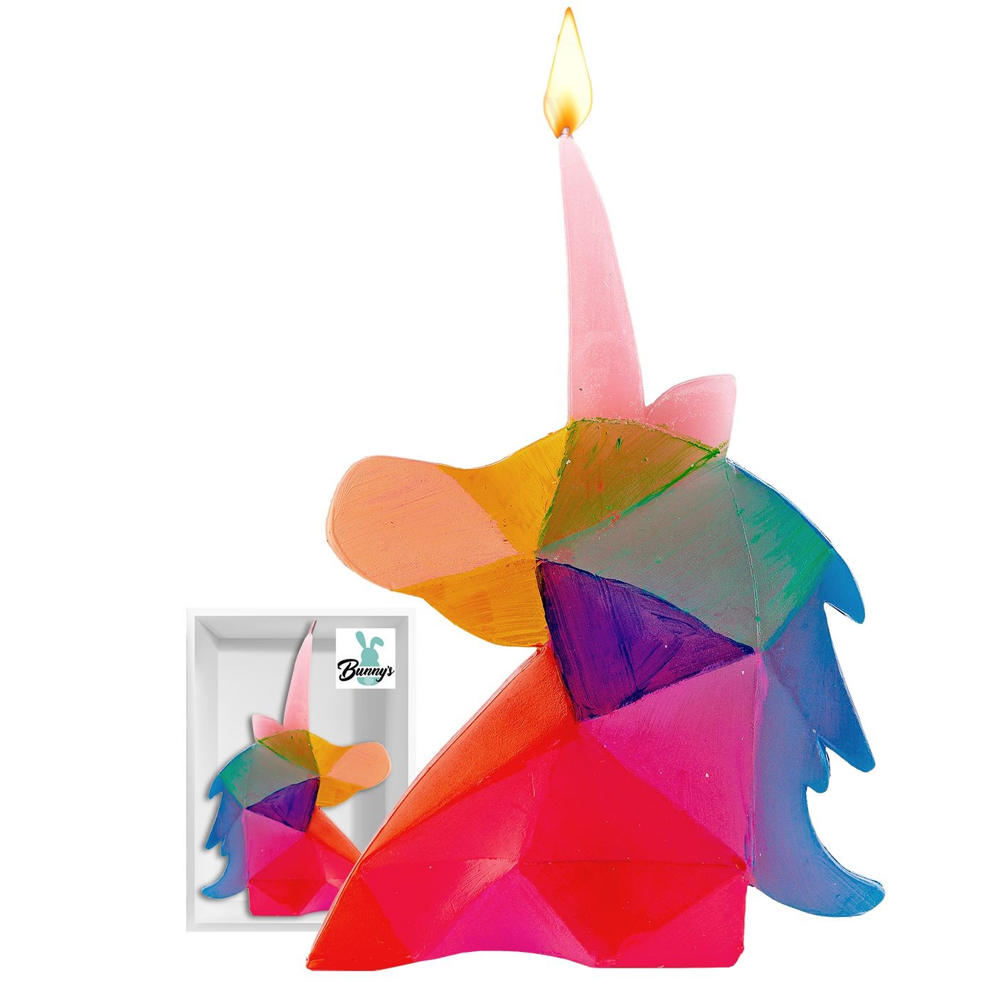 Πρωτότυπο διακοσμητικό κερί σε σχήμα 3D μονόκερου με πολύχρωμο γεωμετρικό σχεδιασμό. Ιδανικό για παιδικά δωμάτια, θεματικά πάρτι ή ως ιδιαίτερη ιδέα δώρου για μικρούς και μεγάλους.